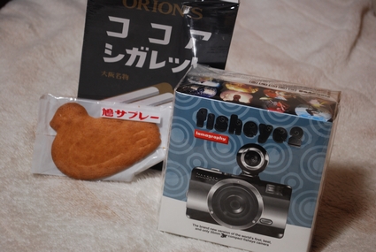 伝家の宝刀、ヴィレヴァンにてプレゼントをいただきました。fisheye2とココアシガレット、鳩サブレ。