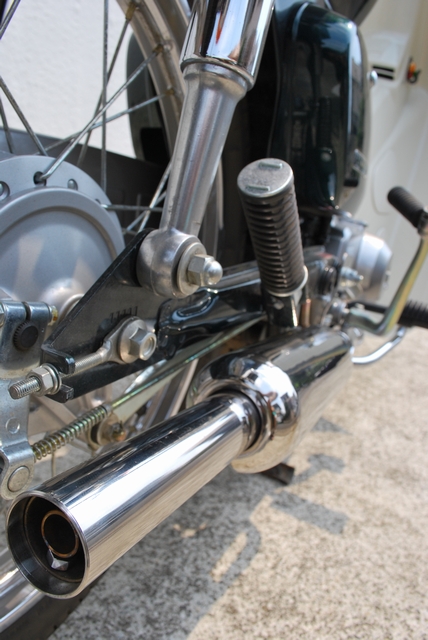 んで、前回の日記の「買ったモノ」がこのマフラー。水本レーシングさんに無理を言って製作していただいたキャブトンマフラー。元々は、武川が出しているP-Shooter(キャブトンタイプマフラー)を買おうと思っていたのですが、カブ50用ということでマフラーステーの加工が必要だろうと思い却下。いゃ、正直言えばその程度の加工くらいならやれるのですが、タグさんと被ってしまうのが・・・