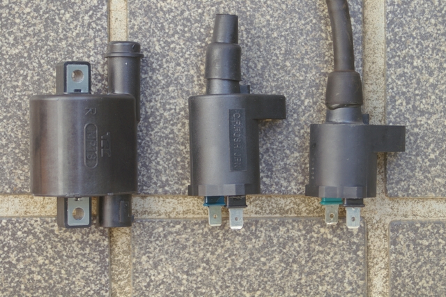 んで今日はI/Gコイルとプラグケーブルとプラグを交換。写真は左からRS125、C.F.POSH製Racing-IG-Coil、C90純正のイグニッションコイル。今回は真ん中のC.F.POSH製を装備させました。プラグケーブルはNGKのPowerCableを、プラグは同じくNGKのイリジウムCR6HIXを。I/Gコイルに気が向きすぎていて、プラグケーブルの長さがちょっと長めになってしまった(・ω・`;)