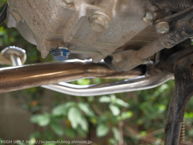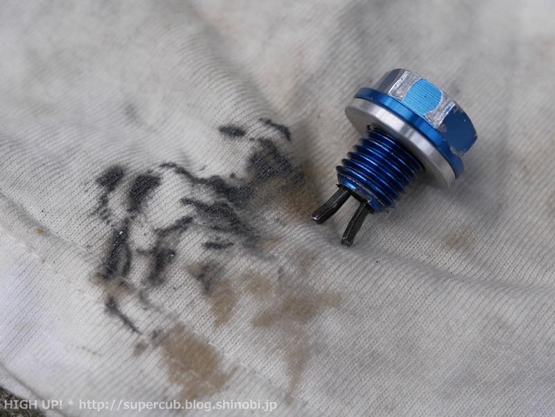 さて、オイル交換するかーってことでエンジン下を覗き込んで思い出す。マグネット付きドレンボルトに交換していたこと。笑 このボルトは初代カブロウで利用していたものです。盗まれたころにはテンプメーター付けていて、センサーをドレンボルトで取っていたのでこのマグネット付きは外しておりました。