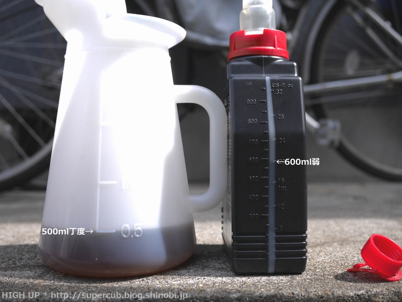 たぶん、オイルジョッキーが正しいのでオイルジョッキー側のメモリで600ml計量しエンジンへ投入。