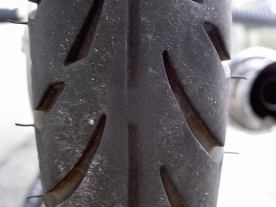 今日、気分が良かったので某林道に走りに行きまして…リアがすべるなぁ、なんて思いつつ帰宅して調べたらこの有様。他のスリップサインはまだ大丈夫そうですが、そろそろ交換せねば。ありがとう、一代目バトラックス!僕たちは君の勇姿を決して忘れない!君に交換してから一度もパンクしなかった。本当に大好きだ、バトラックス。