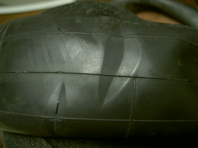 お店の人によると、もしかしたら空気が少ない時期にチューブがよれてしまって、その癖がついたところに穴が開いたのでは?という事でした。確かに穴は折り目にありますもんね。…にしても、この感じだとかなり昔から穴開いていたみたいですね(汗) そうそう、かなりの穴が空いていたのにそんなに空気漏れがなかったということでタフアップチューブ、今回は効果ありましたね。この寄れている所を握ると、なんとなく中にゲルがあるのがわかりました。