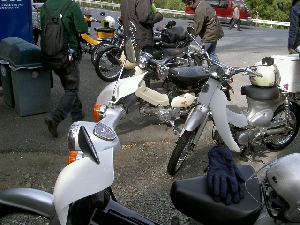 とか思ったのでよっさんにメール。地図で道志道への行き方を調べて出発。道志道に突入。対向車線を走るバイクは全部3ケタ排気量のモンスターマシン。カブなんて一台も走っていない…さらに不安になる。3時までに合流できなかったらよっさんからのメールを見よう!と決心して数分走る。前にも見たことのあるコンビニを通過…しないっ!カブ軍団発見。そして、合流!!
