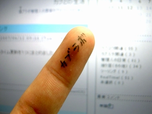 ▲指に〝カブラボ〟と書いてある