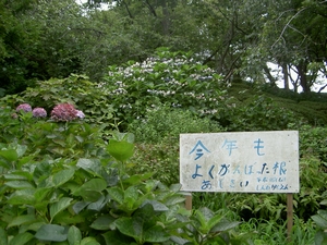 一週間近く洗車していないので汚い…写真よりも実際はもっと汚いです。本当は今日洗車したかったのですが、夕立があると聞いてやめました。やっぱり夕方に雨が降ったのでやめておいて正解でした。カブロウを駐車場の片隅に停めて園内を散策。するといきなり気になる看板が…