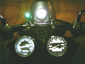まぁ、確かにそこまで悪くないのかも。でも、いくつか問題が。まずスピードメーターケーブル。ライトケースに干渉するためライトケースに防護フィルムなどをはるか他の対策が必要。さらに、Fフォークとレッグシールドの間におそらくメーターケーブルが入るので、ハンドルを切ったときにケーブルが挟まる。走行安全性の低下。それと、スピードメーターやタコメーターから出ている配線が丸見えになるので格好悪い気がするのですけどね。暇な時にでもやってみます。簡単なように見えて案外大手術になるかも。確か、ハンドルクランプをとめているナットはウィンカーステーを外さないと取り外しが出来なかった気が。やってみて、格好悪かったらショックだなぁ。
