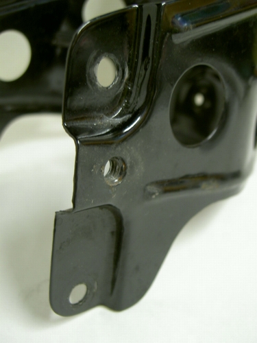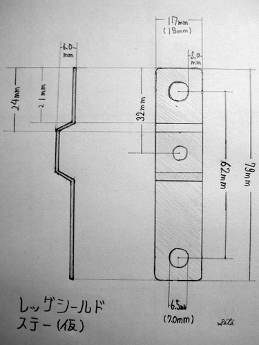 上下の2箇所がこのステーをフレームに固定する穴で真ん中の穴がレッグシールドをとめる穴です。コンビニフックなどはここにねじ込む事になります。この部分はナットが溶接されています。これらの形状などを簡単に計測して仮バージョンとしてステーの原案をアップします。