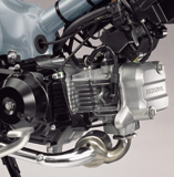上の写真がインジェクション化されたエンジン周り。クランクケースはどのカブも黒でマフラーの形状もかなり違いますね。