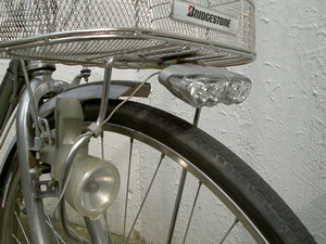 左側にあるダイナモライトが純正でついていたもの。カゴ下のLEDライトは後付した点灯虫というライト。ちなみにこの型の点灯虫は「暗すぎる」と不評ですぐにモデルチェンジしたとか。車体代とカスタム代を合わせると、私がカブロウに装備させたボアアップキットくらいの値段にはなる代物。3段変速人動力自転車。27インチと言う点ではカブを凌駕しています。