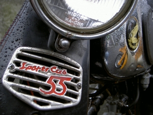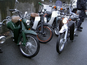 エドさんのスポーツカブ(C115)。フロントやタンクのエンブレムが格好いい。話を聞いたところ、直してからの初走行が今回だったとか。無事にお帰りになったようで何よりです。
