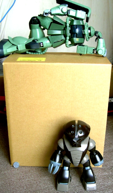 ボアアップキットの箱の大きさです。ただ写真を撮っただけではわかりにくいかと思ったのでいろいろつけてみました(笑) 手前のがMGのアッガイで乗っかってるのがPGのザクです。ちなみに、箱の左下においてあるのが1円玉です。参考になりますか?(笑) ちなみに、重さはそこそこあります。でも、この感動…priceless!w