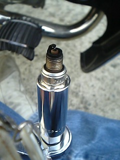 そういえば昨日、メインジェットを交換するかしないかで悩んでいたときの事です。現行は#105で、プラグの状況を見て頭が白かったら#110に変更しようと思っていました。プラグの頭は狐色。私が見る限りでは最高のコンディション。でも、薄いとエンジンに悪いらしい…濃いほうがまだ問題はないと聞いていたので番手をあげるか悩んでいました。すると、近所のオジさんが前の道を通りました。いつもどおり