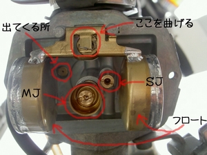 今日いじったのは、ジェット類やスクリュー類ではありません。つまり、初心者が手を出してはいけない域です。キャブレータのフロート室をMJ交換の容量であけます。すると、いつも通りそこにはフロートさんがいらっしゃいます。フロートさんの付け根を覗き込みます。