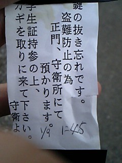 …それはシートに張られていました。守衛さんが巡回中にカブロウに挿しっぱなしにされている鍵を発見して、保護しておいてくれたみたいです。守衛さんのファインプレーによりカブロウ盗難の危機を脱出!しかし、私が学校に行ったのは9時前。紙に書かれた時刻は1時45分。この間のおよそ5時間の間に気づいた輩はいなかったのだろうか?とりあえず、守衛さんの所へ行き感謝を伝え帰宅。今に至ります。…新年初登校の日にとんだアクシデントでした(汗)