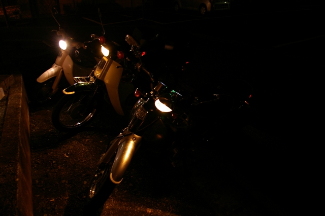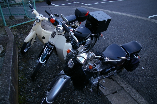 先日、たまたま市内をゼルビスで流していたところ中学・高校時代の友人ただくんに遭遇(写真:一番手前黒銀リトル)。最近バイク仲間が居なくてつまらないとメールで言っていたのに、見知らぬカブ乗りさんと走っているではないか!(写真:一番奥ベージュリトル)